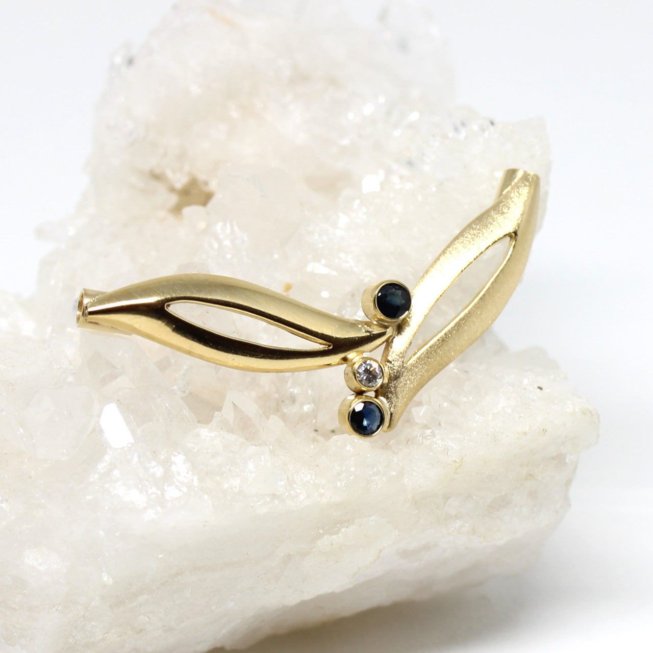 Diese feine Wechselschließe ist genau das richtige für Liebhaber der dezenten Schmuckstücke. Die Schließe erinnert an zarte Blüten und ist auch vom Gewicht her sehr angenehm. Gefertigt ist sie aus 333er Gelbgold. Zwei blaue Saphire und ein weißer Zirkonia runden das ganze ab.