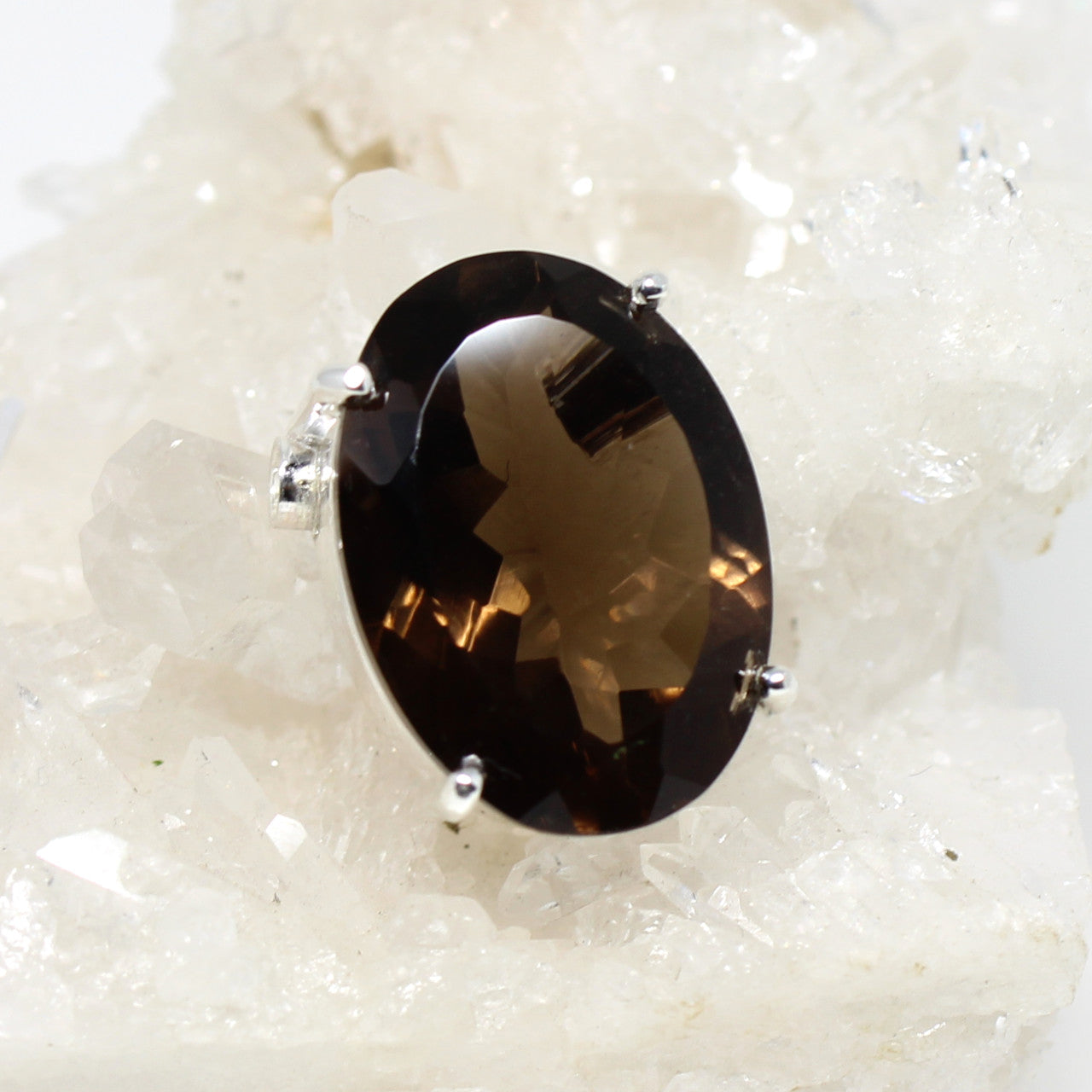 Dieses aparte Meisterstück beeindruckt vor allem durch den aufregenden Rauchquarz! Der Schliff des Edelsteines verleiht ihm einen magischen Ausdruck. Man muss diesen Stein von allen Seiten betrachten und bekommt das Gefühl nicht mehr weg sehen zu können. Der Rauchquarz hat eine besondere Schliffart bei der eine gewisse Tiefe entsteht. Der Stein bekommt Leben eingehaucht. Eingerahmt ist der Rauchquarz von 925er Sterlingsilber. Das Edelmetall wurde auf hochglanz poliert und unterstreicht somit die Hochwertigkeit des Rauchquarzes.
