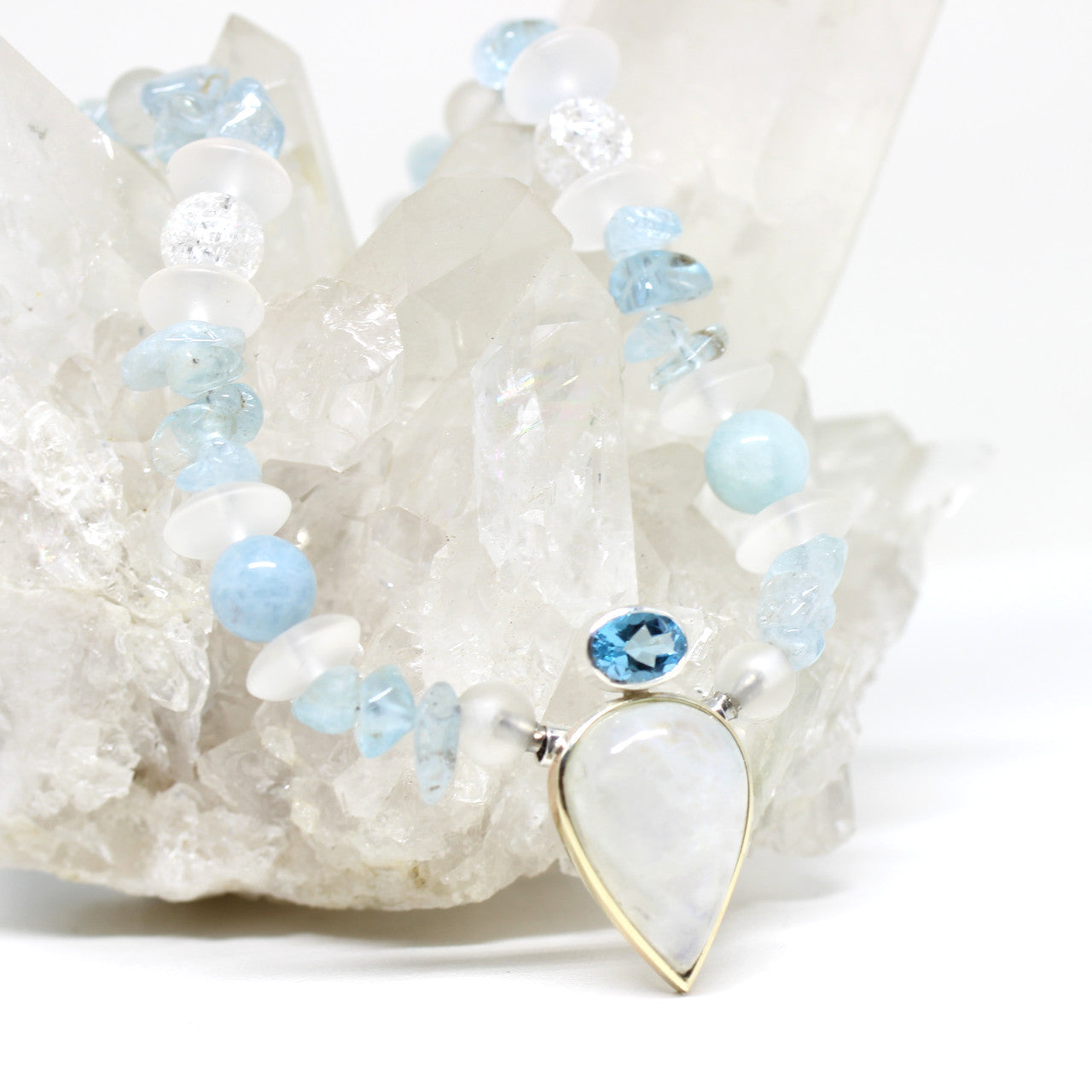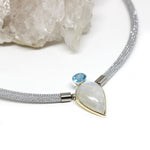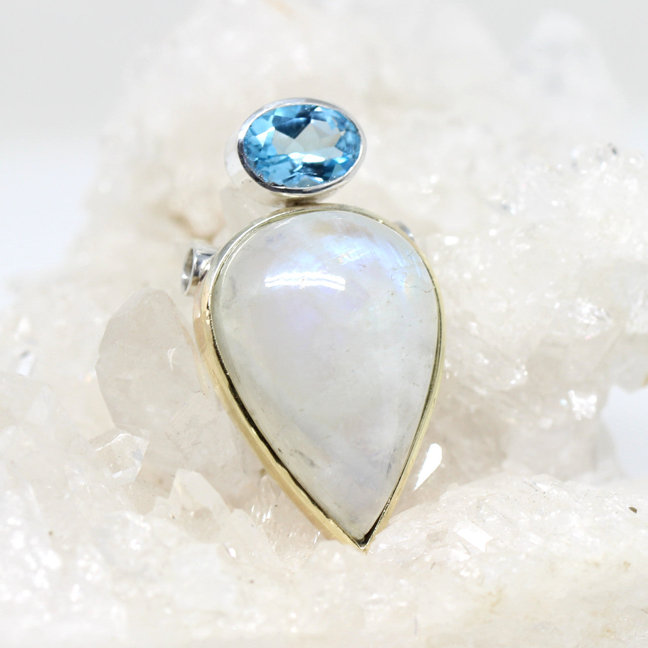 Ein neues Schmuckstück kommt eben aus unserer Werkstatt. Wir haben die Wechselschließe in zweifarbig hergestellt, das bedeutet wir haben zum einen 925er Sterlingsilber und zum anderen 333er Gelbgold verwendet. Somit kann man die Schließe optimal kombinieren. Ergänzt haben wir das Edelmetall mit zwei hochwertigen Edelsteinen. Einen wundervoll geschliffenen Blautopas und einen Regenbogenmondstein im cabochon Schliff. Die beiden Edelsteine harmonieren farblich ideal miteinander und bilden zu den hochwertigen Materialien eine stimmige Verbindung.