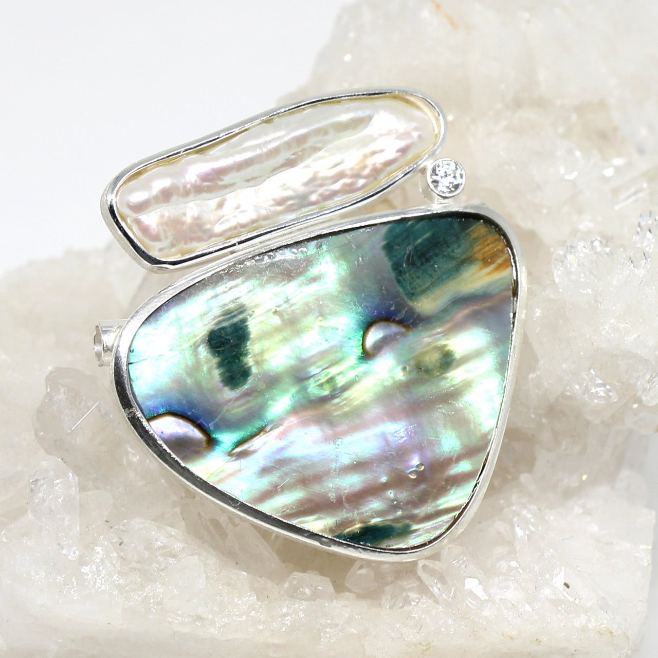 Ein echter Blickfang stellt diese handgefertigte Wechselschließe dar. Die Paoamuschel hat ein sanftes Farbspiel das an ein Aquarellbild erinnert. Als Begleiter der Muschel kommt eine weiße Süßwasserperle zum Einsatz. Diese harmoniert perfekt mit dem seidenen Glanz der Paoamuschel. Ein funkelnder Zirkonia verbindet beide Perlen. Eingefasst haben wir alles in 925er Sterlingsilber.