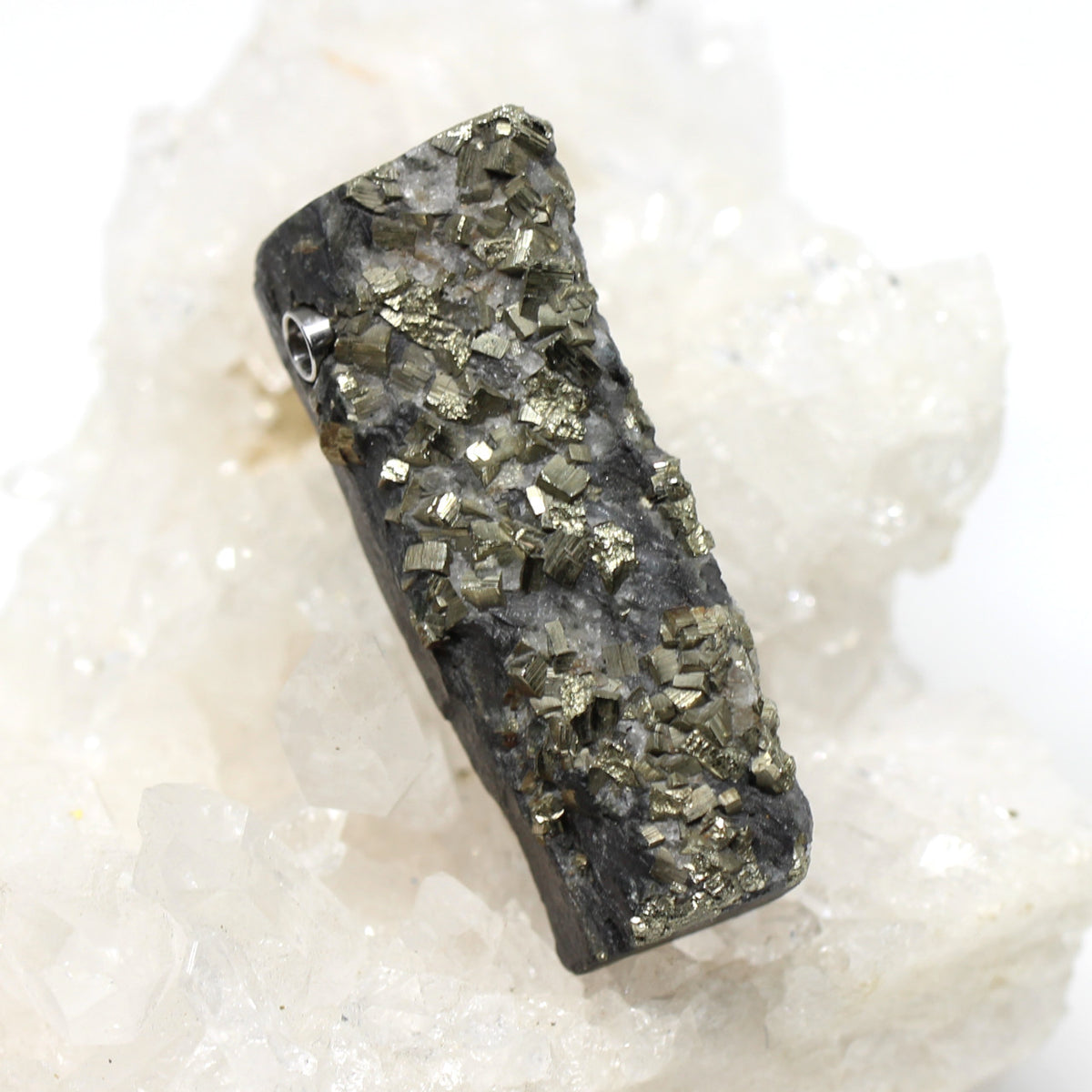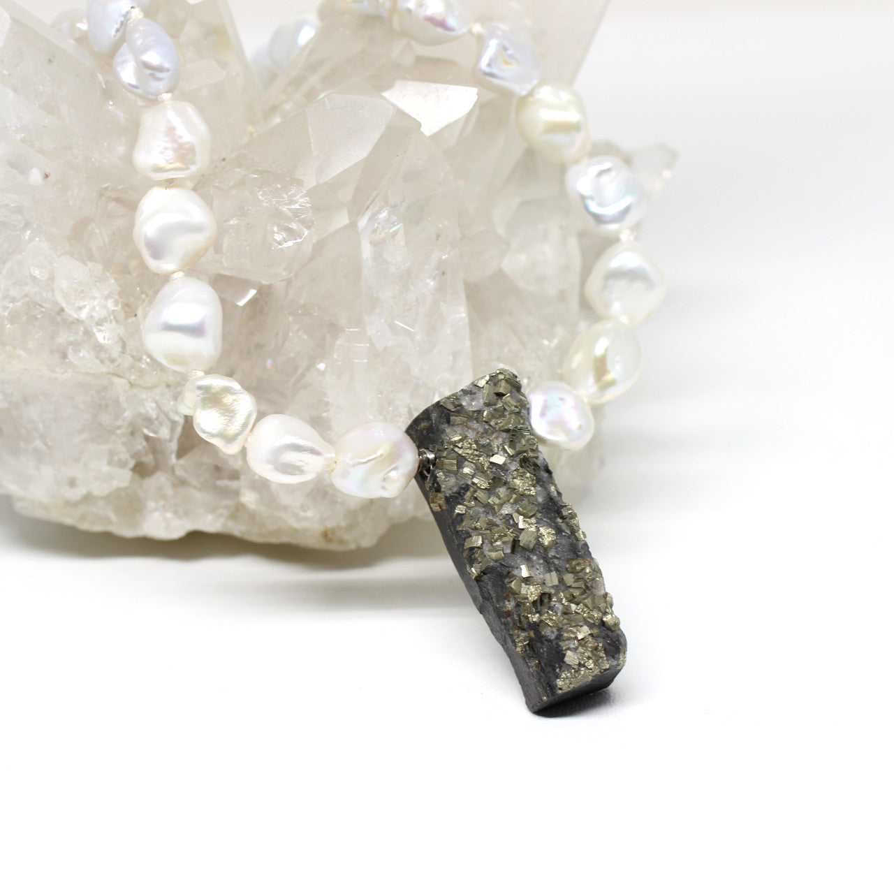 Einer der häufigsten Steine für unser Wechselsystem ist und bleibt der Schiefer Pyrit. Es war ziemlich der erste Stein den wir damals als Schließe umgearbeitet haben. Die Faszination dieses Steines ist auch jetzt ganz nah. Die Harmonie die dieser Stein einbringt ist wunderschön anzusehen und bereitet große Freude diese in den Kombinationen zu erleben. Der Schiefer Pyrit entfaltet beinahe in jeder Kette seine einzigartige Wirkung und Vielseitigkeit.
