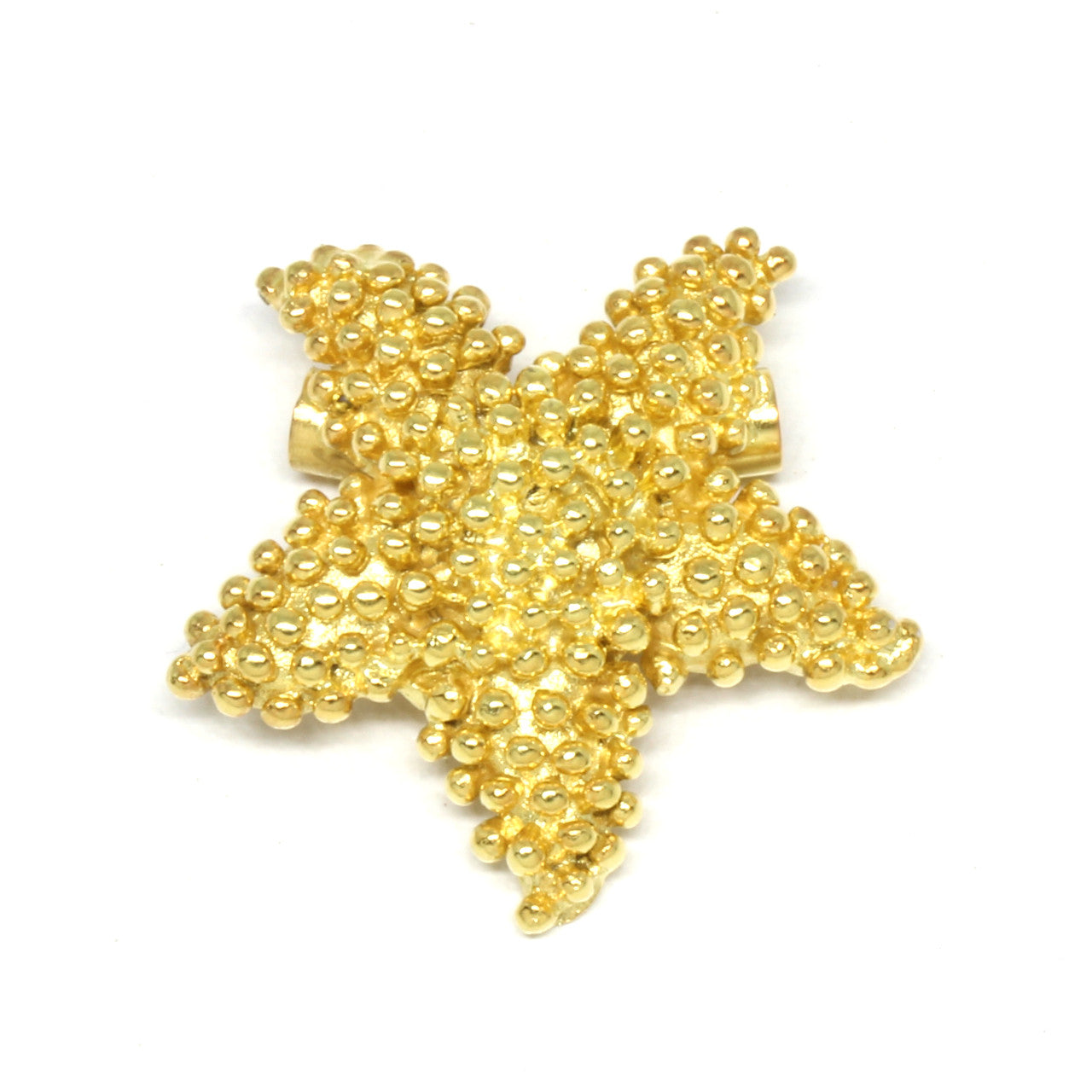 Ein Blickfang für die warmen Monate. Mit dieser Schließe verbindet man automatisch Wärme und Sonnenschein. Der Seestern ist aus 925er Sterlingsilber hergestellt und vergoldet. Die Struktur besteht aus vielen kleinen Kugeln. Verbindet man dieses tolle Schmuckstück mit einer Aquamarinkette kann der Sommer kommen. Natürlich auch in vielen anderen Ketten des Wechselsystems kombinierbar.