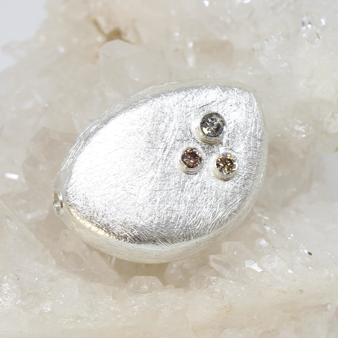 Diese einzigartige Wechselschließe kommt gerade aus unserer Werkstatt. Wir haben sie aus 925er Sterlingsilber geschmiedet und drei unterschiedliche Brilliante eingearbeitet. Dadurch erhält der Verschluss eine edle Optik. Wir haben uns hier für einen sogenannten Salt and Pepper Brillant, einen schokoladenbraunen Brilliant und einen champagner farbenen Brilliant entschieden. Insgesamt hat das Schmuckstück 0,25 ct.