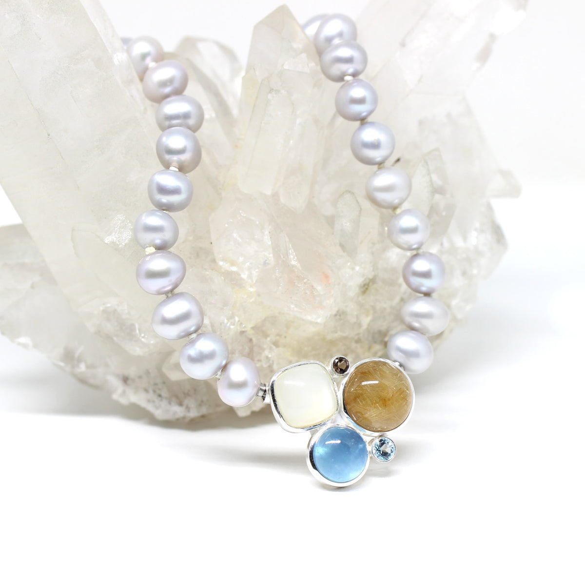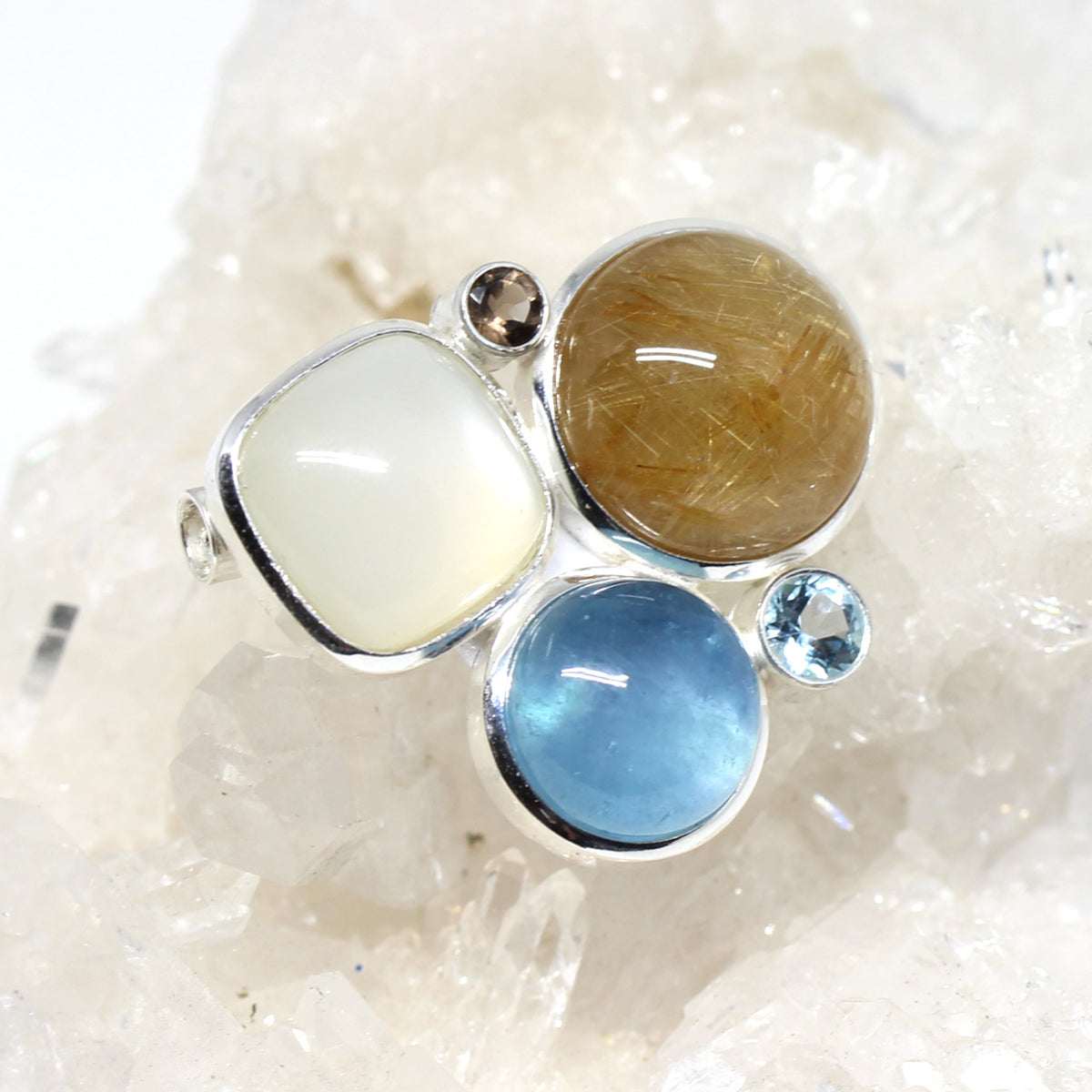 Ein echter Blickfang stellt diese handgefertigte Wechselschließe dar. Im Fokus steht ein edler Rutilquarz, welcher mit seinen goldfarbenen Nadeln verzaubert. Als Begleiter kommen ein weißer Mondstein, ein himmelblauer Aquamarin, ein funkelnder Blautopas und ein brauner Rauchquarz zum Einsatz. Die Edelsteine stehen in perfekter Harmonie zueinander. Eingefasst haben wir alles in 925er Sterlingsilber.