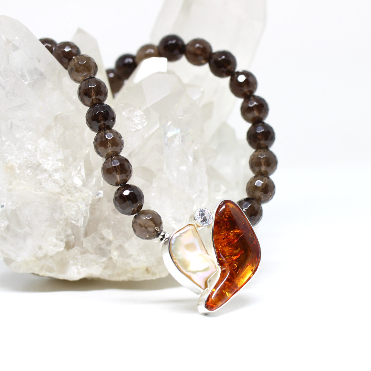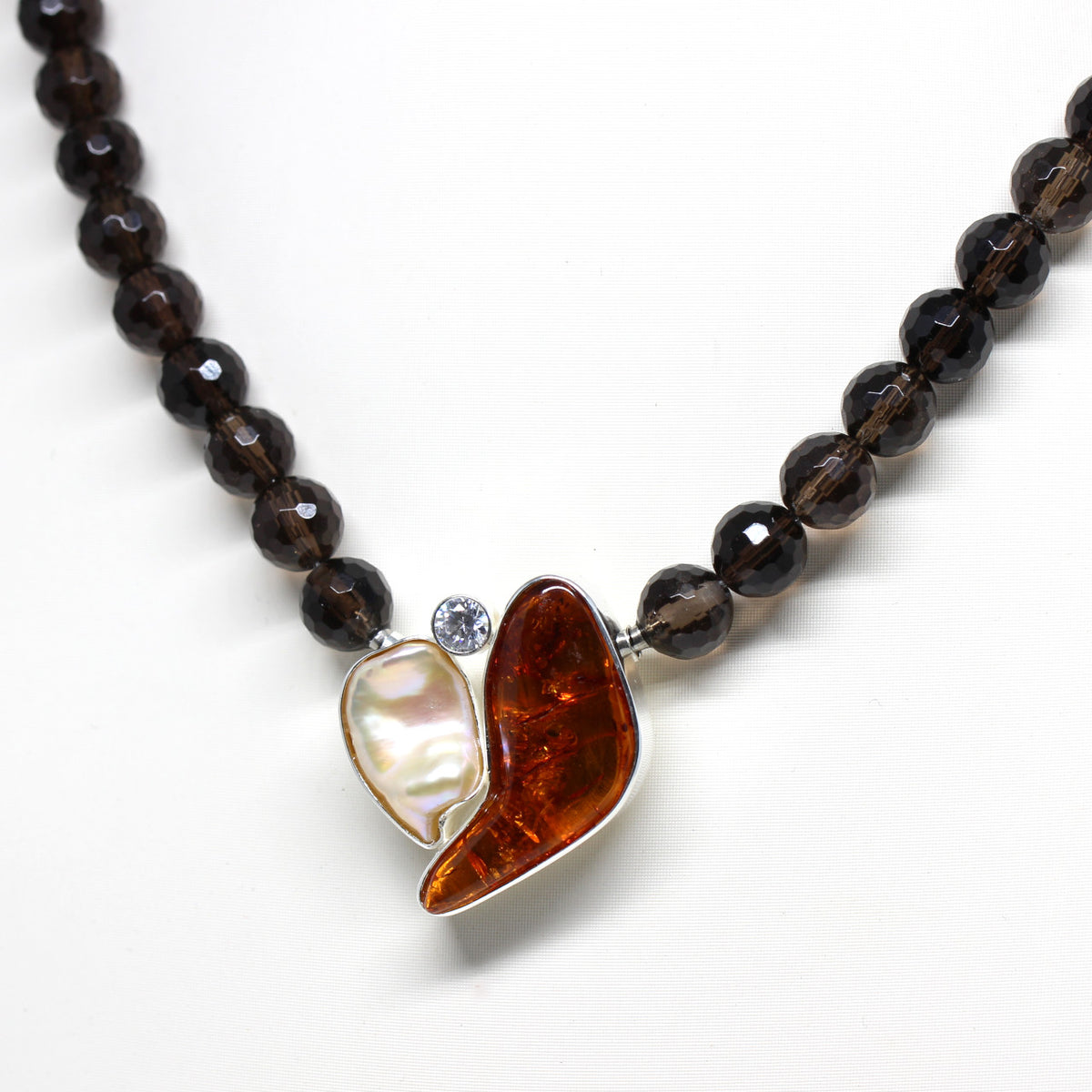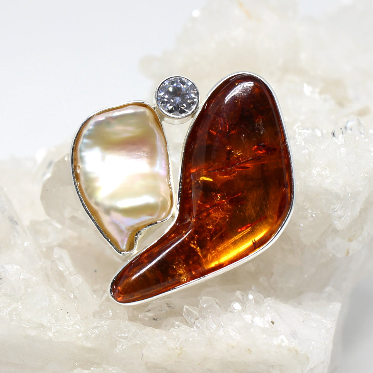 Ein echter Blickfang stellt diese handgefertigte Wechselschließe dar. Im Fokus steht ein Bernstein welcher von einer cremefarbenen Süßwasserperle begleitet wird. Diese rundet das Schmuckstück perfekt ab und harmoniert ideal mit dem natürlichen Edelstein. Eingefasst haben wir alles in 925er Sterlingsilber. Ein Zirkonia setzt zusätzliche Akzente.