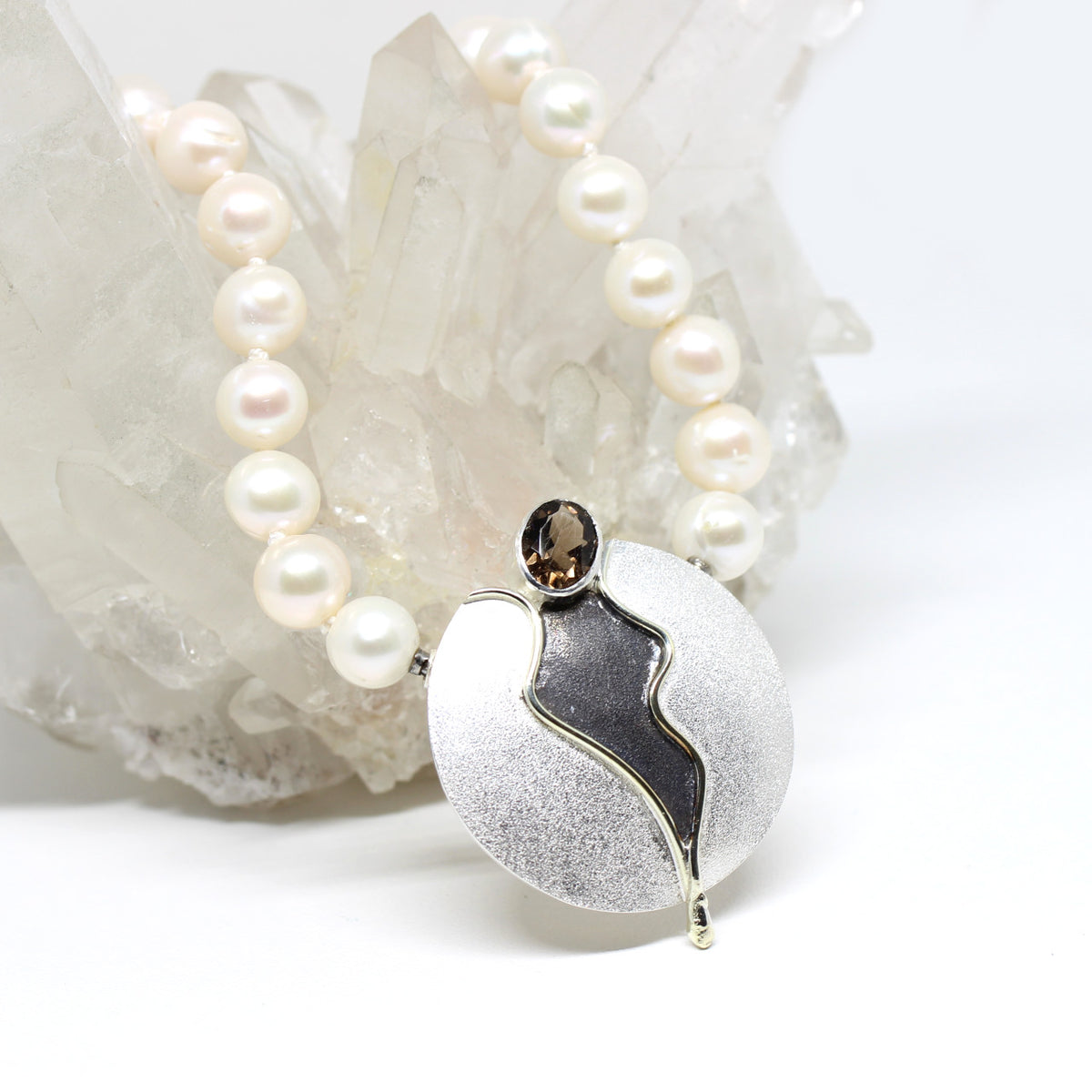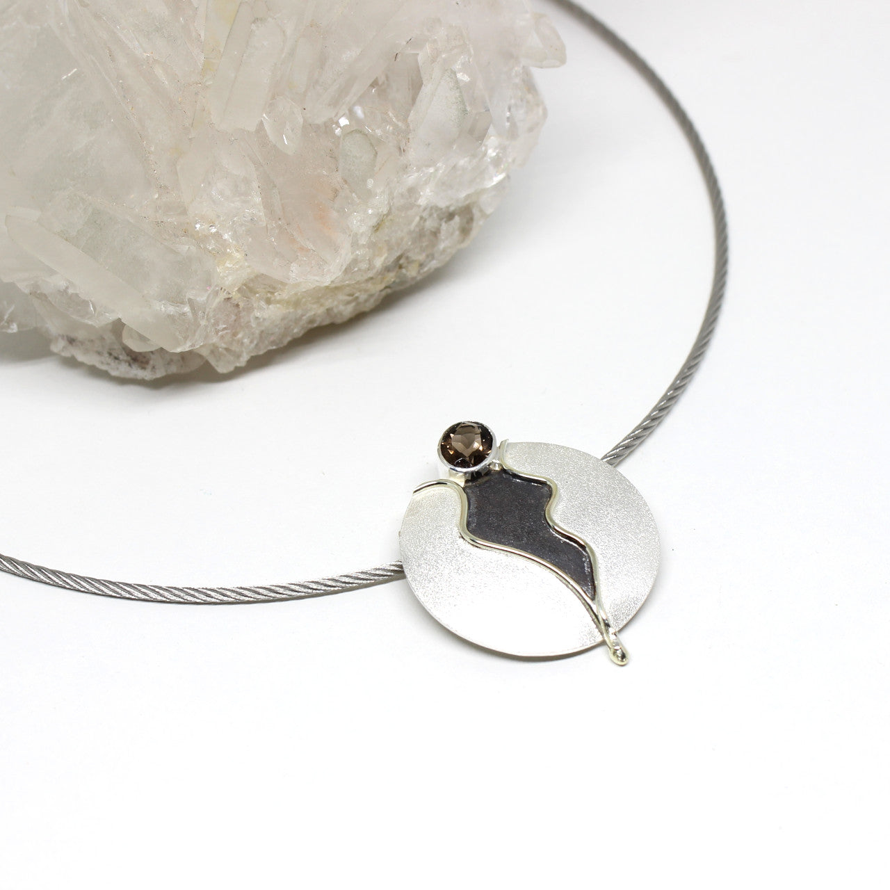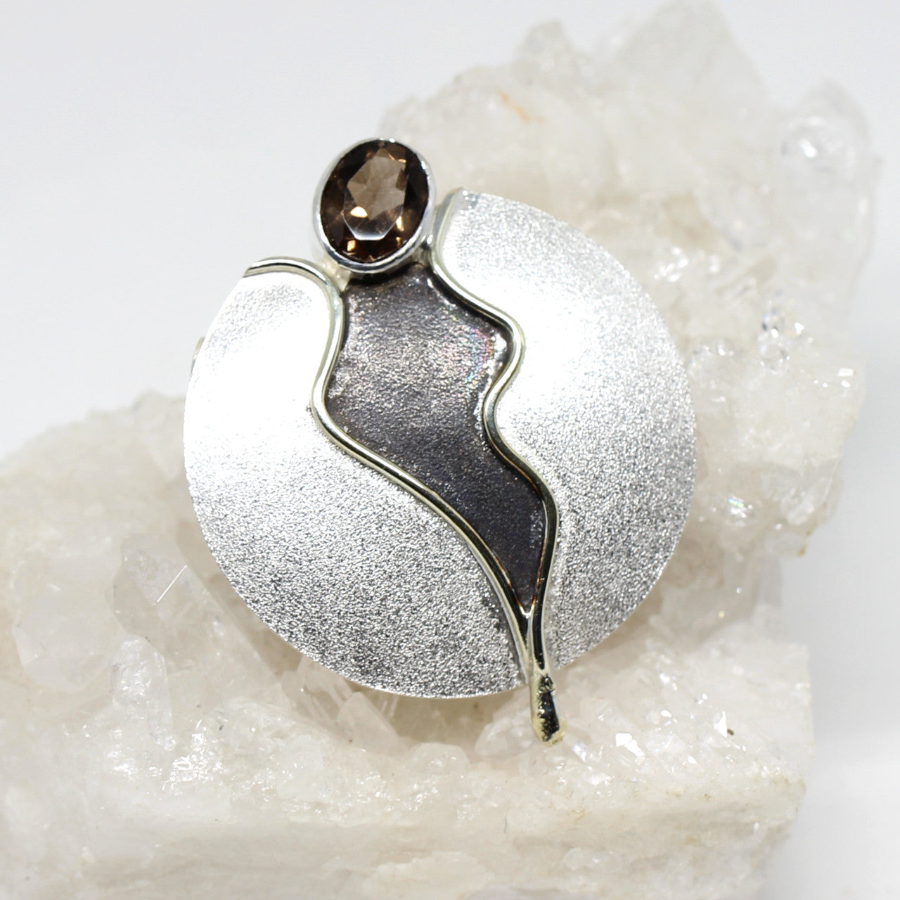 Dieses einfallsreiche Schmuckstück ist in unserer kleinen Werkstatt entstanden und somit ein Einzelstück unserer Goldschmiedin. Die Herstellungsart dieser Schließe ist exklusiv und modern. Der außergewöhnliche Verschluss besteht aus einer Farbverbindung von drei Teilen. Die Grundfarbe bildet 925er Sterlingsilber. Das Innenleben der Schließe lockert ein 333er Golddraht mit oxidierter Innenfläche auf. Ein weiterer Blickfang bietet der facettierte Rauchquarz. Die Besonderheit dieser Schließe liegt darin, das man sie als Wechselschließe und als normalen Anhänger tragen kann.
