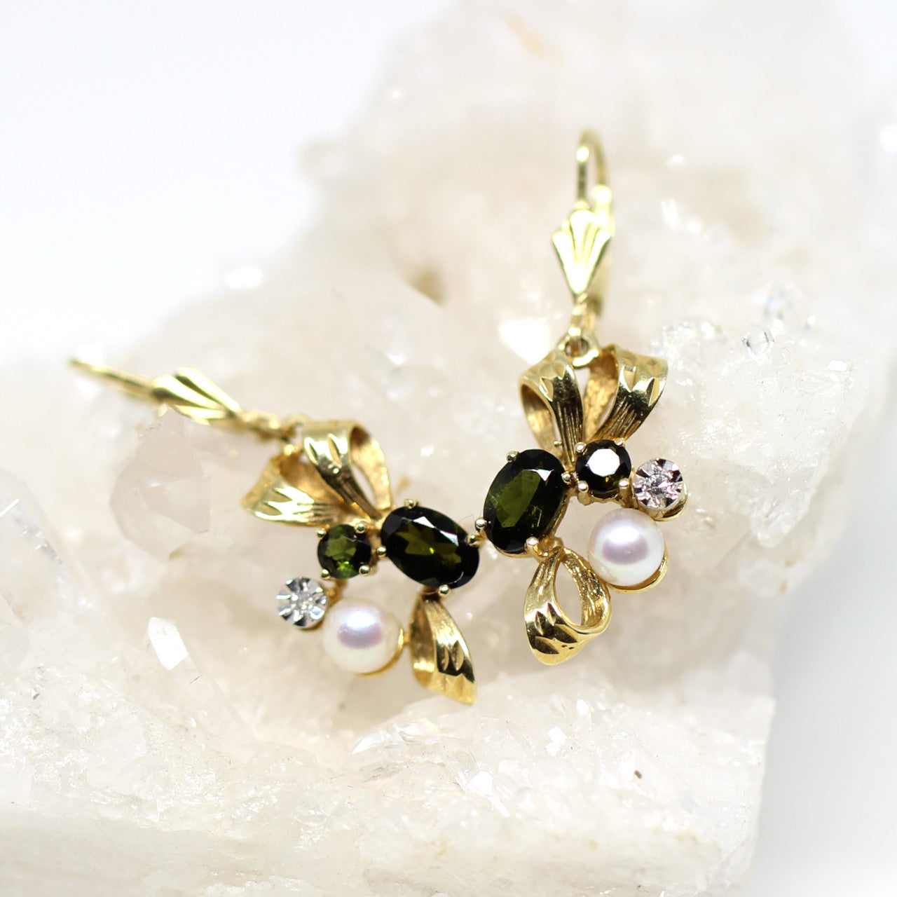 Diese wundervollen 585er Gelbgoldohrringe sind ein echter Blickfang. Die wunderbaren, grünen Turmaline in Verbindung mit dem kleinen Diamant sieht edel und besonders aus. Zusätzlich ziert noch eine Süßwasserperle den Ohrschmuck.