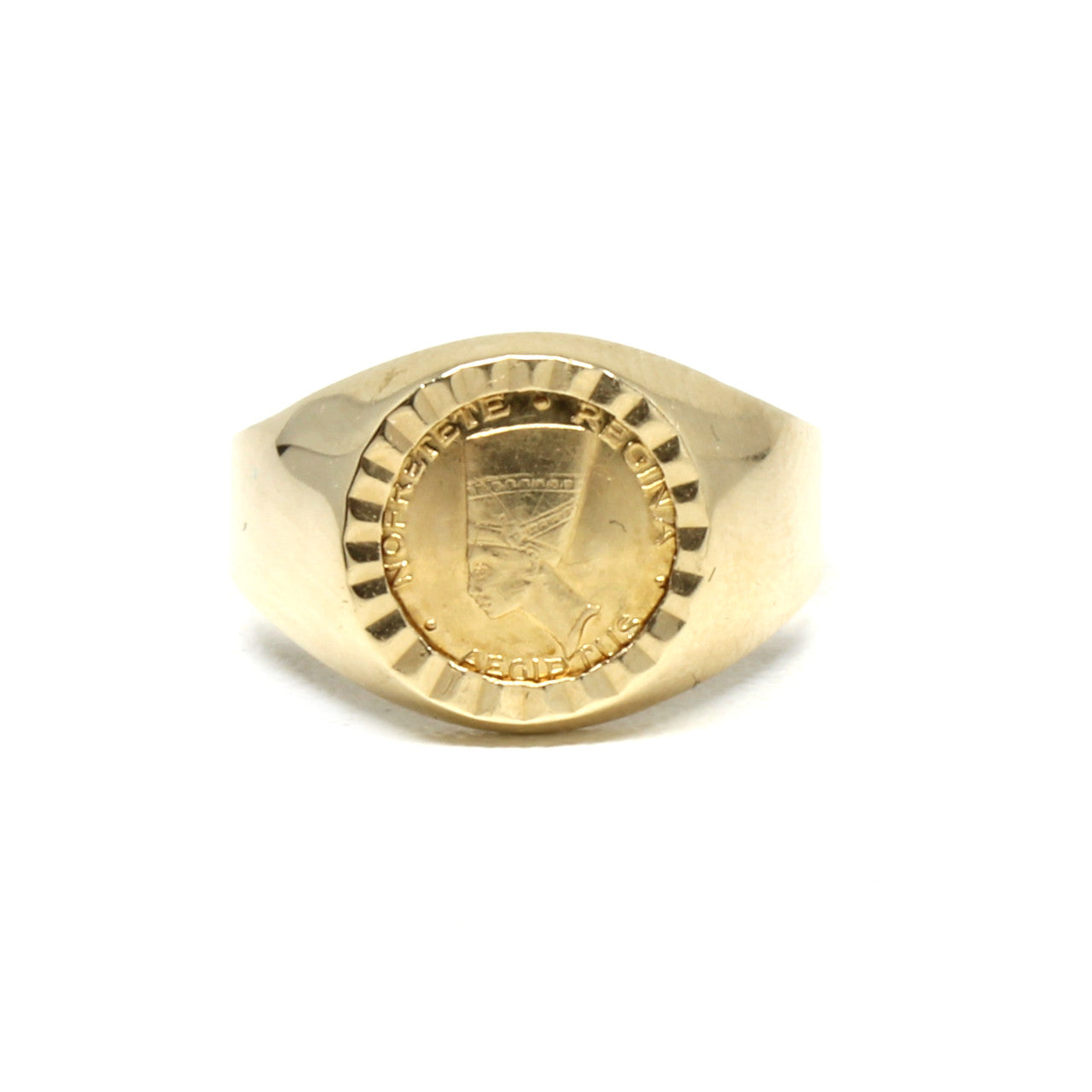 Dieses zeitlose Schmuckstück besticht mit einer Goldmünze als Mittelpunkt. Auf der Vorderseite dieser sieht man einen Pharaonen. Der Ring ist aus 585er Gelbgold hergestellt und die Rückseite der Münze offen gehalten. Somit kann man auch die zweite Seite der Münze betrachten. Das Schmuckstück ist komplett poliert.