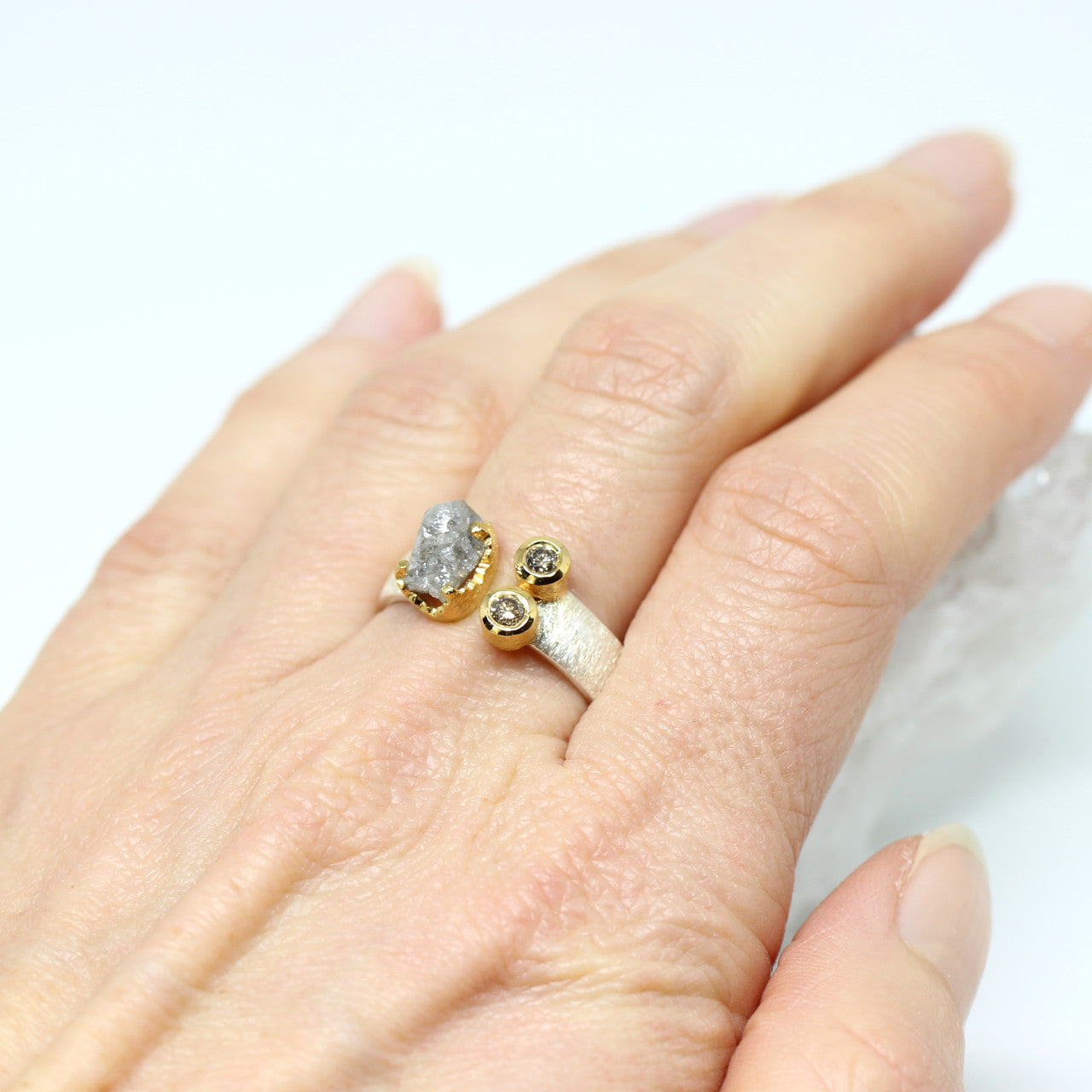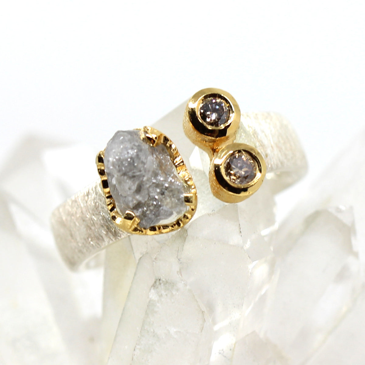 Dieser atemberaubende Silberring ist ein gnadenloser Blickfang. Die aufregenden Edelsteine sind besonders und fallen direkt ins Auge. Es handelt sich hier um zwei funkelnde, champagner farbene Brillanten und einen Rohdiamant. Alle drei Edelsteine verbinden sich zu einem harmonischen Schmuckring der verzaubert. Das Material ist 925er Sterlingsilber welches teilweise vergoldet wurde. Die Oberfläche ist eismatt.