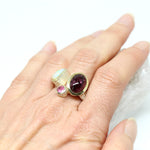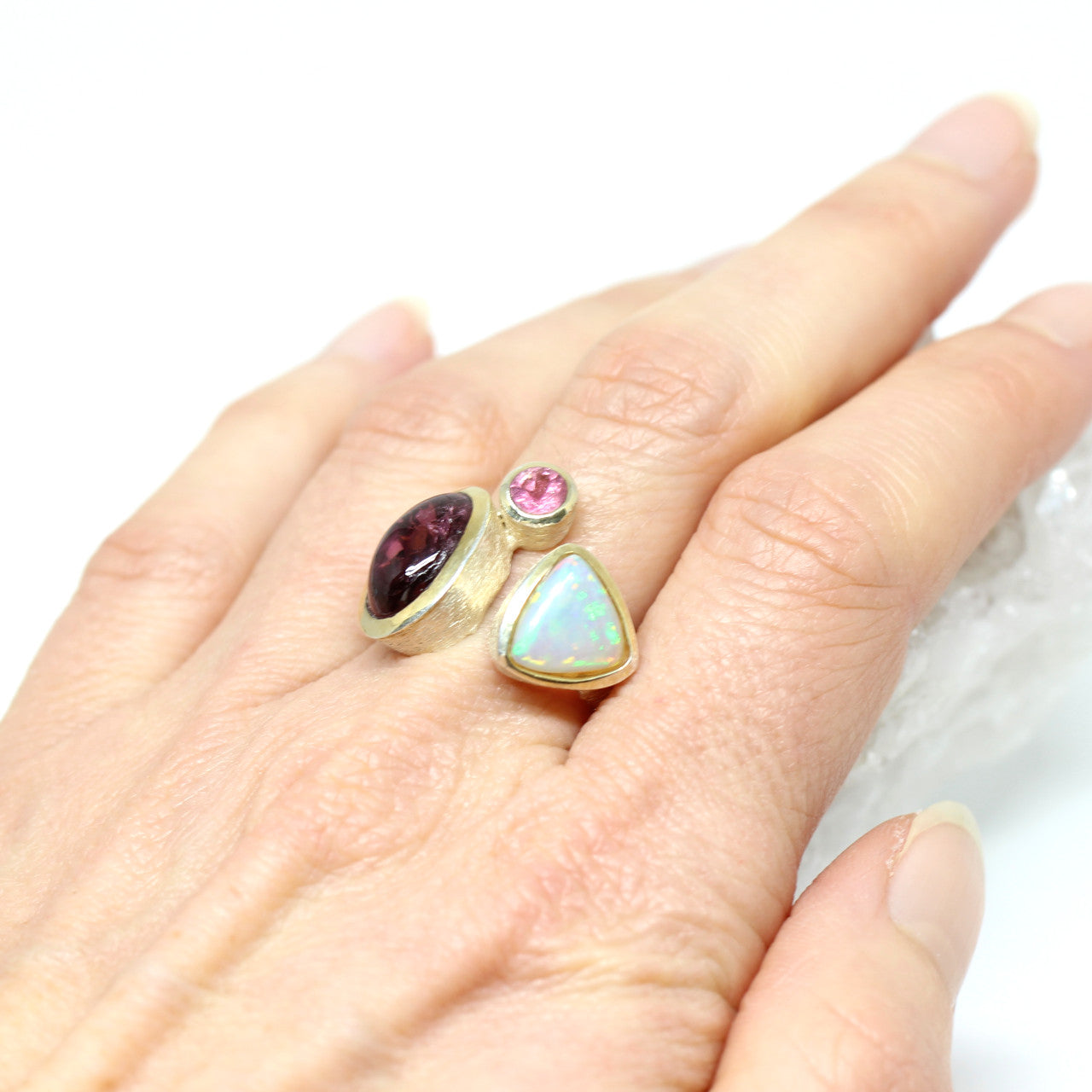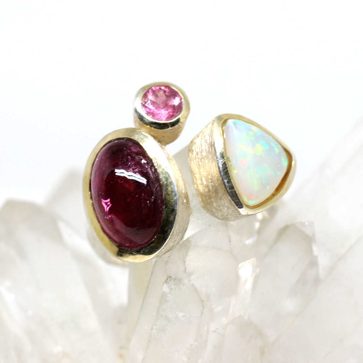 Dieser atemberaubende Silberring ist ein gnadenloser Blickfang. Die aufregenden Edelsteine sind besonders und fallen direkt ins Auge. Es handelt sich hier um einen schimmernden Opal, einen facettierten Turmalin und einen Turmalincabonchon. Alle drei Edelsteine verbinden sich zu einem harmonischen Schmuckring der verzaubert. Das Material ist 925er Sterlingsilber welches teilweise vergoldet wurde. Die Oberfläche ist eismatt.