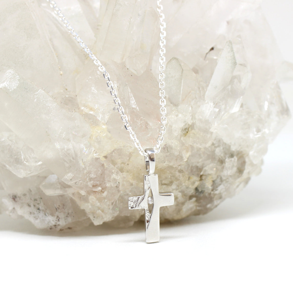 Dieses Kreuz aus 925er Sterlingsilber hat eine abwechslungsreiche Oberflächenstruktur. Ein Teil ist poliert, der andere hat eine spezielle Mattierung. Zudem ziert ein funkelnder Zirkonia das Schmuckstück.