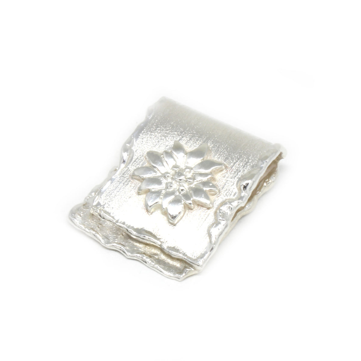 Diese Wechselschließe wertet jede Tracht auf! Das Modell haben wir aus 925er Sterlingsilber handgefertigt und zählt somit als Eigenprodukt unserer Goldschmiede. Mit unterschiedlichen Oberflächen versehen wirkt das Schmuckstück raffiniert und wertvoll zugleich. Das Edelweiß ist hochglanz poliert und erhöht aufgearbeitet, somit steht die Blüte im Fokus. Den Hintergrund haben wir mit unserer speziellen Technik bearbeitet und mattiert welcher ideal zur Tracht harmoniert.