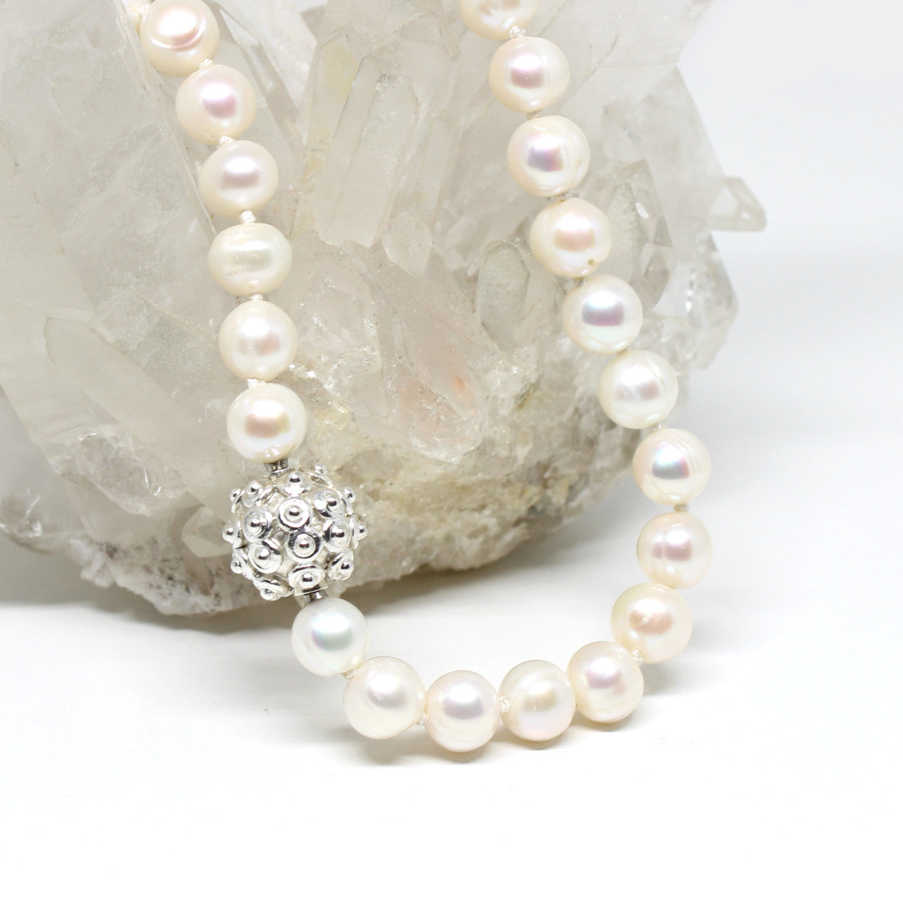 Dieses schöne Schmuckstück ist der perfekte Start in die Welt des Wechselsystems. Es handelt sich dabei um ein Set das aus einer weißen Perlenkette und einer gemusterten Silberkugel besteht. Diese beiden Elemente eignen sich super als Startset, da sie sich hervorragend kombinieren lassen. Vor allem die Kugel harmoniert gut mit Adaptern und bietet somit eine gute Grundlage in diesem Bereich.