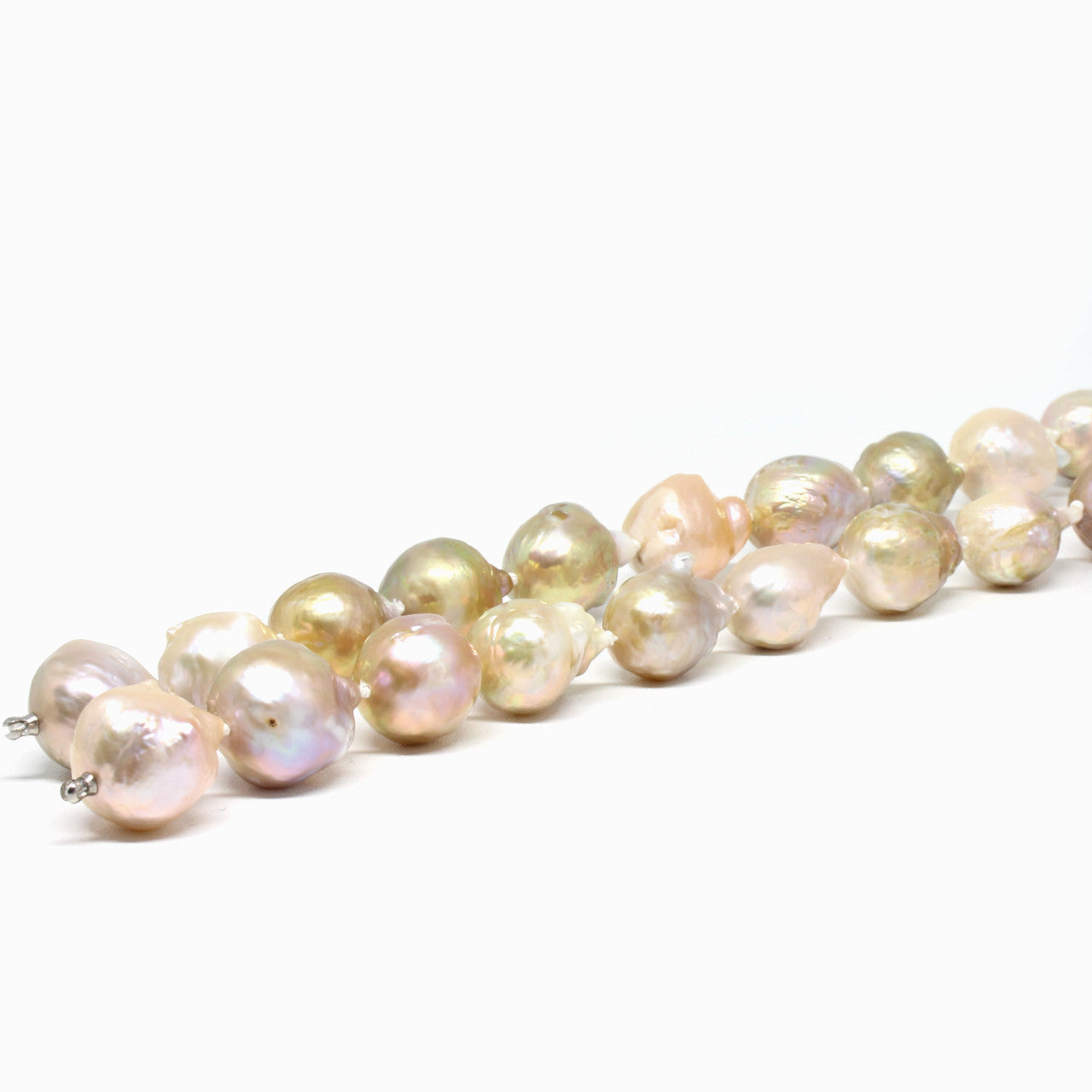 Diese außergewöhnliche Perlenkette besticht vor allem mit Größe und Form der Perlen. Es ist ein Schmuckstück das einem direkt ins Auge sticht und von dem man den Bick kaum abwenden kann. Der Lüster der Perlen ist sehr schön und bringt die Haut zum strahlen. Man kann diese Wechselkette mit beinahe jeder Schließe kombinieren, doch vor allem Spielereien mit dem Adaptersystem wirken Ausdrucksstark in der Kette.
