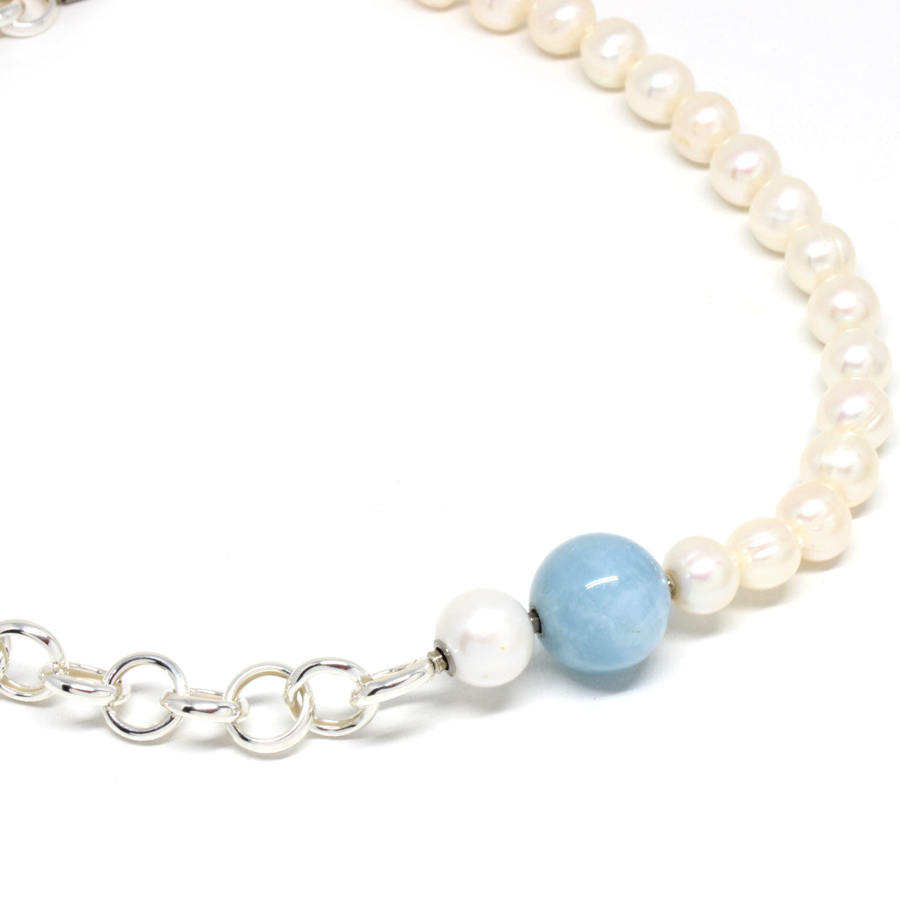 Begrenztes Angebot! Diese kreative Wechselkette ist der ideale Begleiter durch das Wechselsystem. Sie bietet ein modernes Schmuckstück das sich vielseitig tragen und variieren lässt. Das Komplettangebot setzt sich zusammen aus einer Wechselkettenhälfte in Silber und eine aus Süßwasserperlen. Zudem bekommen Sie einen einseitigen Adapter Süßwasserperle und eine Aquamarinkugel dazu. Zum verschließen im hinteren Bereich haben wir einen Edelstahlstab eingefügt.