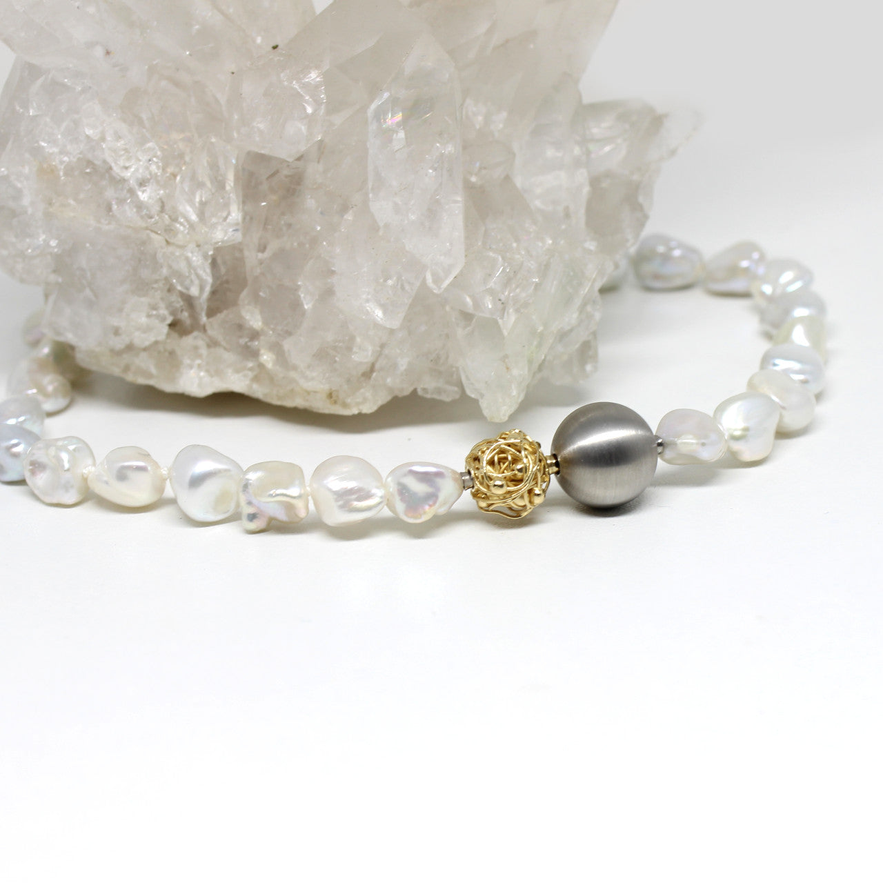 Diese außergewöhnliche Perlenkette besticht vor allem mit Größe und Form der Perlen. Es ist ein Schmuckstück das einem direkt ins Auge sticht und von dem man den Bick kaum abwenden kann. Der Lüster der Keshiperlen ist sehr schön und bringt die Haut zum strahlen. Man kann diese Wechselkette mit beinahe jeder Schließe kombinieren, doch vor allem Spielereien mit dem Adaptersystem wirken Ausdrucksstark in der Kette.