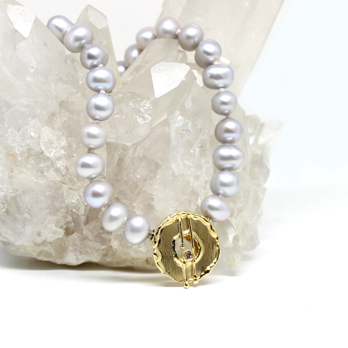Diese Wechselschließe zeigt sich klar im Stil von Schmuckwiedu. Mit der Handarbeit setzt das Schmuckstück einen eigenen Trend welcher stets modern bleibt. Die Abwechslung zwischen unterschiedlichen Oberflächenstrukturen zeigt einen edlen Kontrast. Wir haben die Schließe in unserer Goldschmiede hergestellt und als Material 333er Gelbgold verwendet. Als Blickfang haben wir einen champagner farbenen Brillanten eingefasst.