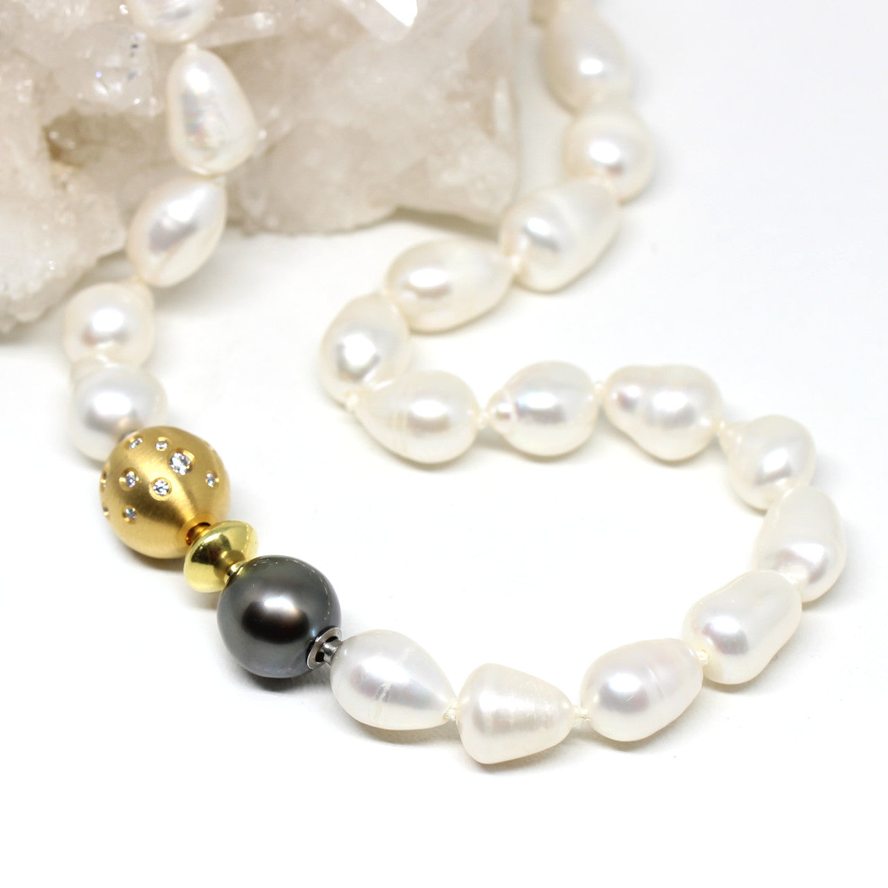 Das Besondere bei einer Tahitiperle ist ihre natürliche Farbe die nicht eingefärbt wird. Je nach Lichteinfall variiert der Glanz von grünlich bis grau. Ein Verschluss der ein absolutes Einzelstück ist, das sich sowohl schlicht und elegant, als auch mit einem Adapter modern und kreativ gestalten lässt.