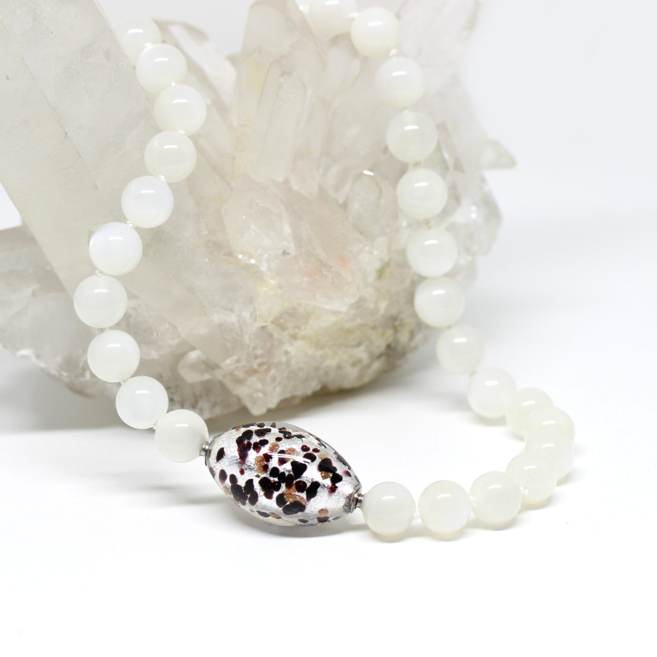 Das Muranoglas trägt seinen Namen von der Insel Murano. Dort werden die Glasperlen in kleinen Werkstätten per Hand hergestellt. Über offener Flamme werden sie mit Blattgold veredelt. Anschließend bekommt die Perle eine letzte Schicht aus Glas. Somit ist das Gold versiegelt und verleiht der Kugel einen Hauch von Luxus. Es handelt sich bei den Perlen um ein spezielles Glas welches nur auf der Insel Murano hergestellt wird. Eben dieses hat die besondere Farbtiefe und Strahlkraft. Diese Leuchtkraft und Qualität unterscheidet Muranoglasperlen von den Perlen anderer Hersteller.