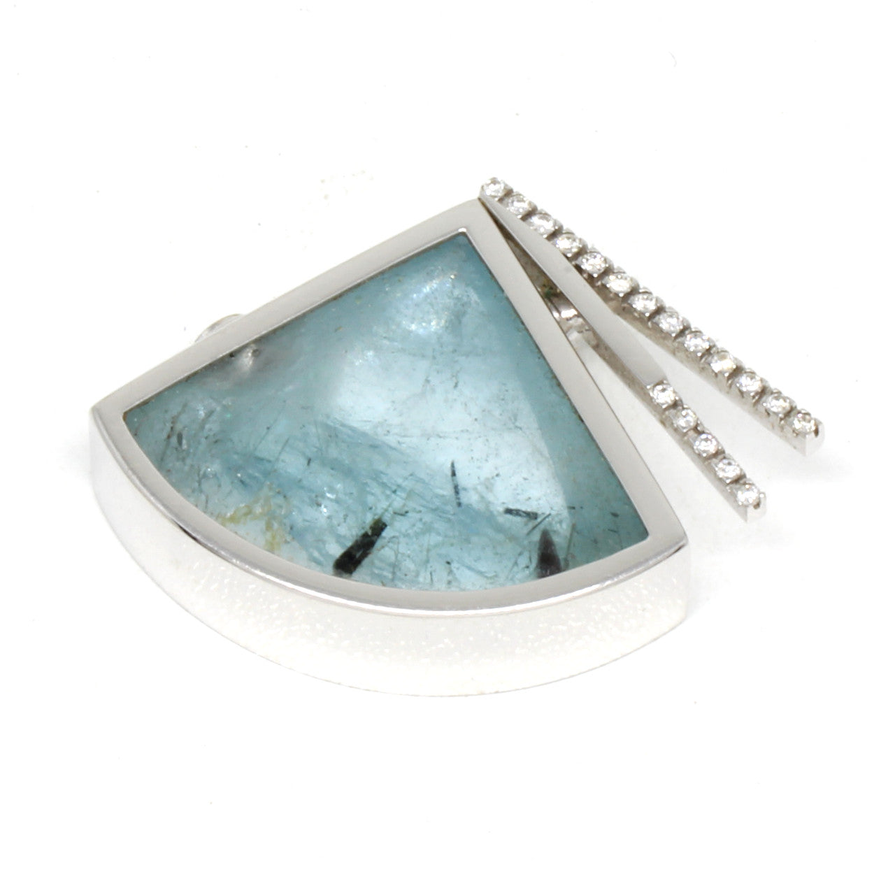 Der Anblick dieser Wechselschließe gleicht einem Feuerwerk! Das Zusammenspiel hochwertiger Materialien und Edelsteinen ergibt ein Unikat der Extraklasse. Der Aquamarin hat ein fantastisches Farbspiel und kommt mit seinem besonderen Schliff excellent zur Geltung. Die sternengleichen Brillanten unterstreichen die Wechselschließe und ergänzen sich wunderbar mit dem Aquamarin. Um dem Schmuckstück einen weiteren Höhepunkt zu verleihen wurden die Edelsteine in 585 Weißgold eingefasst.